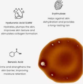 Niezwykle skuteczna technologia poczwórnej opalenizny, zapewniająca natychmiastowy efekt opalania i długotrwały efekt. Bezpieczny i szybki sposób na uzyskanie opalenizny bez szkodliwego promieniowania UV. Jeden z aktywnych składników opalających pozyskiwany jest w procesie tlenowej fermentacji malin: zapobiega wysuszaniu skóry, zapewnia dłuższą i łagodniejszą opaleniznę, zapewniając niezrównaną, naturalną opaleniznę, nie do odróżnienia od prawdziwej letniej opalenizny!